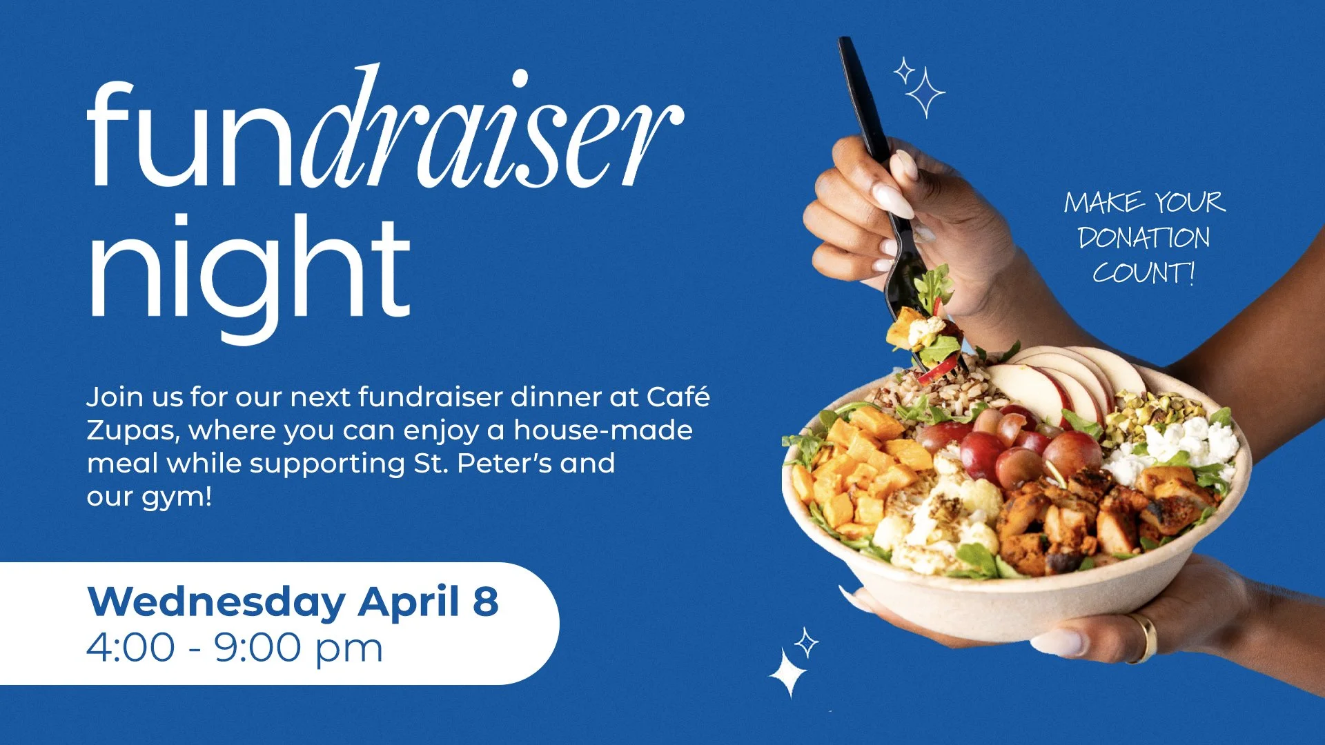 Join us for our next fundraiser dinner on Wednesday, April 8 from 4-9pm at Café Zupas in Edina (2950 W. 66th St. Edina, MN 55423). You can eat with us at the restaurant or order your food online or through the app! Café Zupas will generously donate 20% of all orders and that money will be used for our gym renovation. Thank you for your support and we hope to see you there!