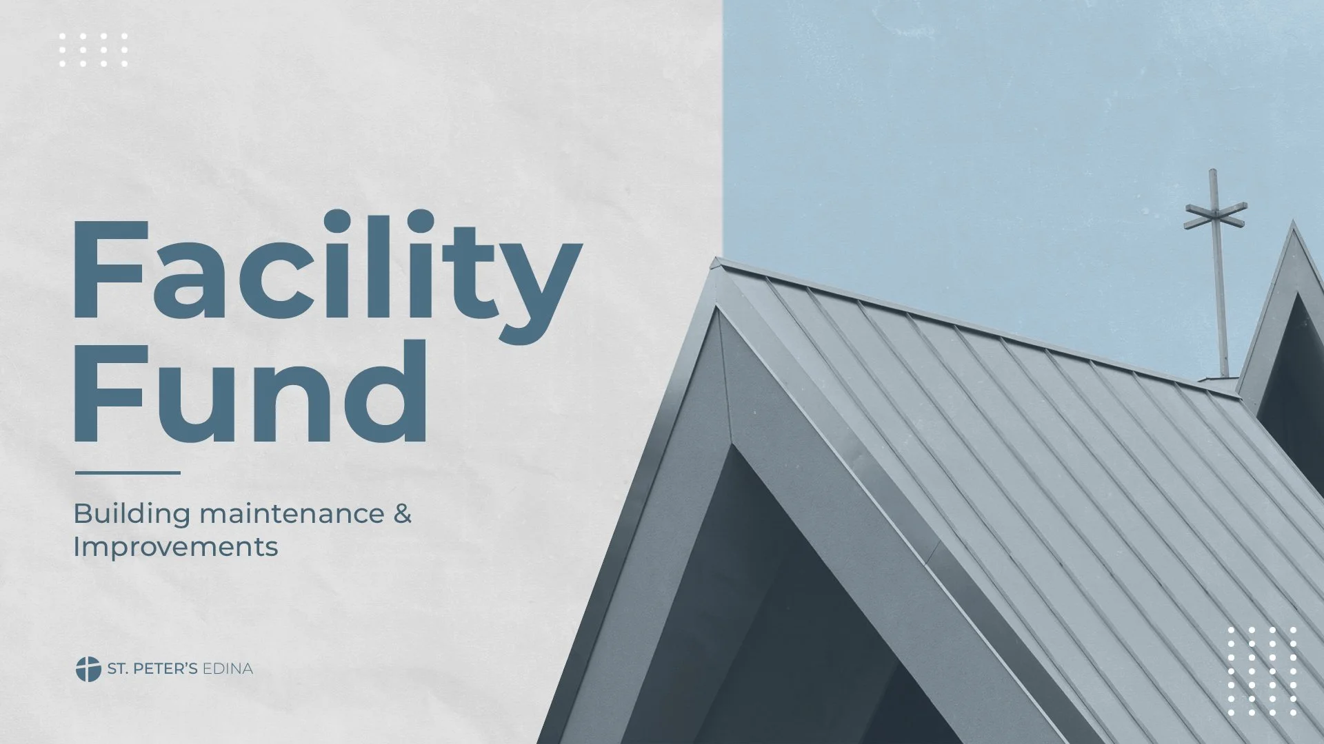 Donations to our facility fund are currently enabling us to make payments on the roof. Last spring we replaced our 30 year old roof at a cost of almost $375,000. This was financed through current donations to the Facility Fund, cash reserves of $200,000, and a $150,000 short term LCEF Ministry Improvement loan.